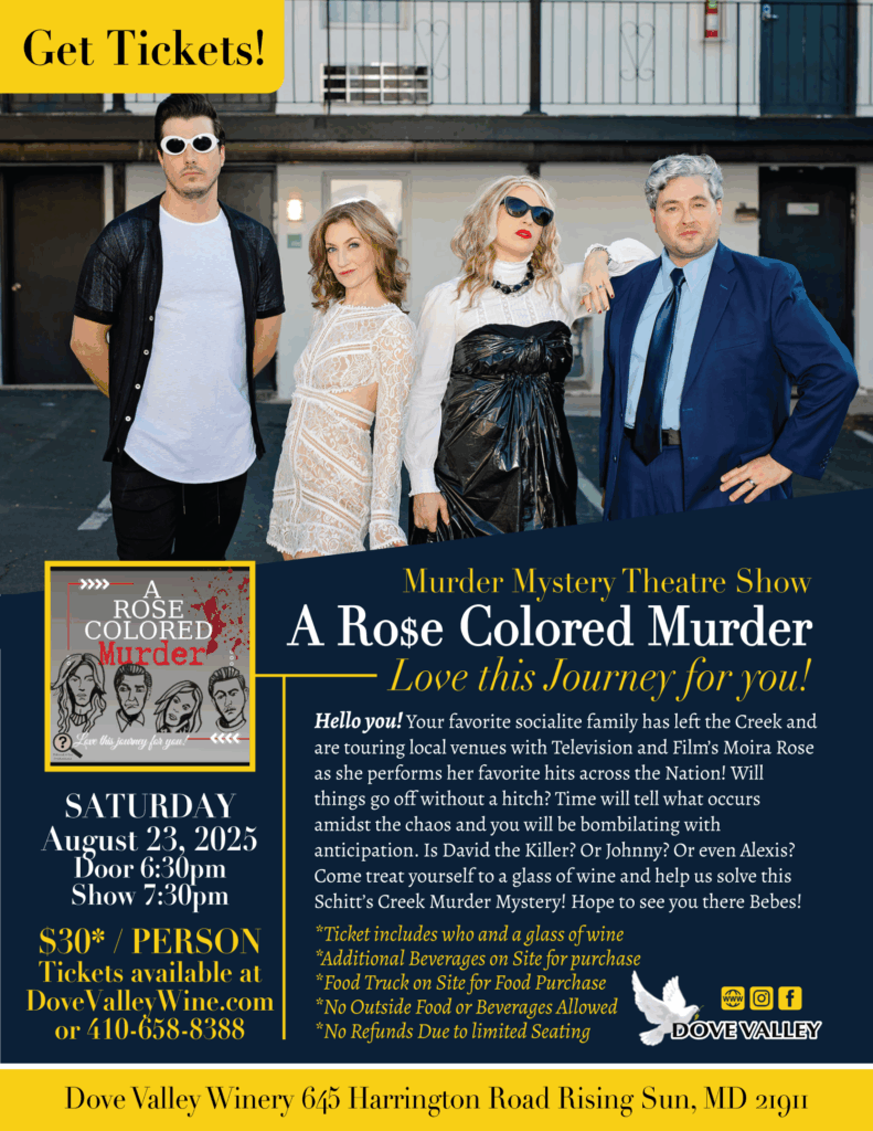 Show & Glass of Wine $30per person Ages 21 and over Doors Open: 6pm Show Starts: 7:30pm Dine N’Dash Food Truck on Site 6-7:30pm